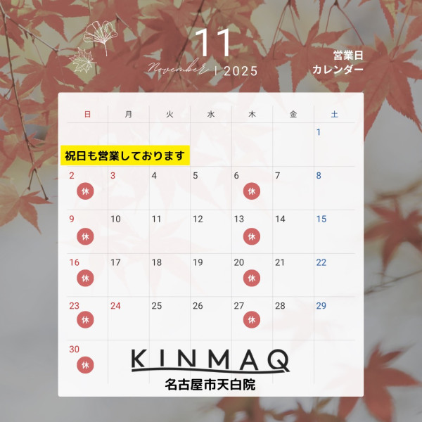 11月の営業日のお知らせ 名古屋市天白区の整体 KINMAQ整体院名古屋天白院です♪ 11月の営業カレンダーを掲載いたします!今月も木日以外は全日稼働となります☆ 11月になり朝方や夜は最低気温もぐっと下がってきました!寒い時期になると筋膜に関連した不調も増悪しやすい傾向にあります!寒さが本格化する前に一度筋膜のケアに当院へお越しくださいませ!